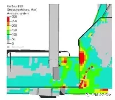 (2)右侧围中门立柱连接处。中门位置由两个立柱通过短梁搭接到车架上。经过四种工况分析,发现在弯曲,极限和转弯工况下,门立柱连接位置均出现应力集中,最大应力均超过300MPa。如图,可见接头处的明显出现应力集中。
