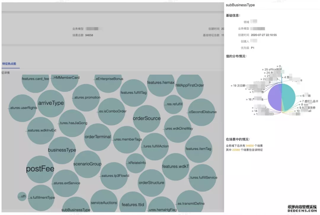以盒马某业务领域为例,下图展示的是最终有效的特征集合,根据基线特征,我们的做法是都标注了具体的含义,如此,便可很容易根据一个领域的业务特征识别出该领域的数据场景。